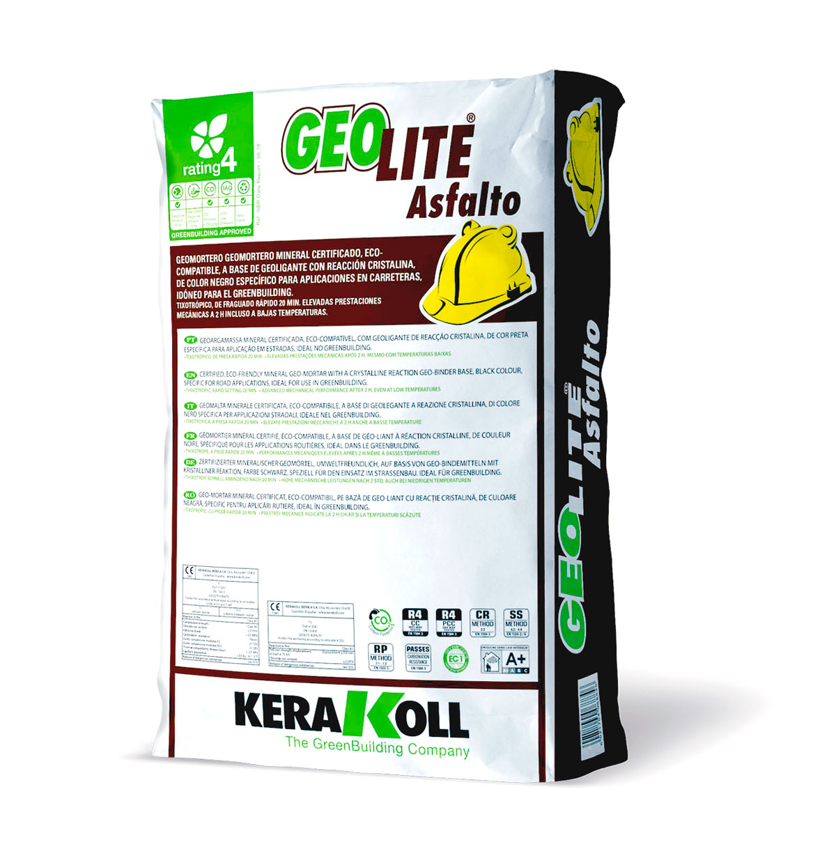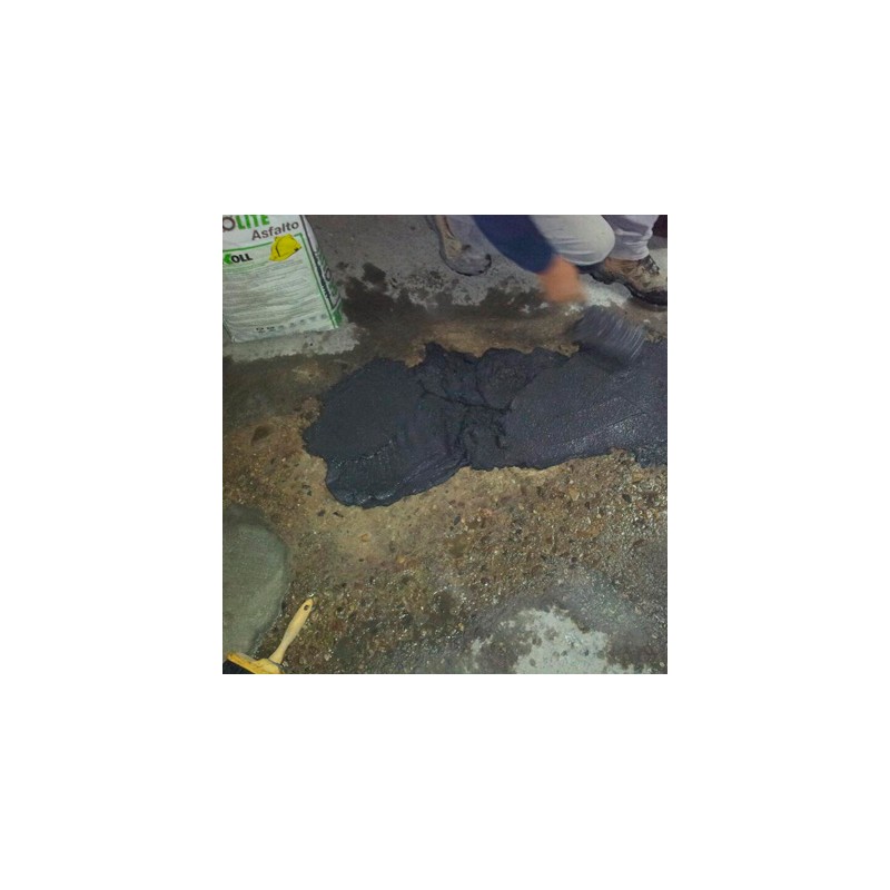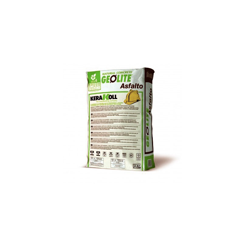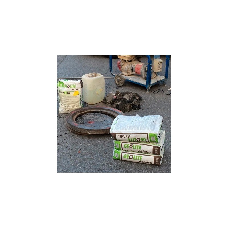 Fijación de barras, tapas de registro y mobiliario urbano, reparación de pavimentaciones industriales, de rápida puesta en servicio incluso a bajas temperaturas, mediante aplicación manual de geomortero mineral certificado, eco-compatible, tixotrópico, de fraguado rápido (20 minutos), a base de Geoligante con reacción cristalina, de bajísimo contenido de polímeros petroquímicos y exento de fibras orgánicas, específico para el anclaje de elementos metálicos, tipo GeoLite® Asfalto de Kerakoll® Spa, GreenBuilding Rating Eco 4, con marcado CE y conforme a las prestaciones requeridas por la Norma EN 1504-3, Clase R4, para la reconstrucción volumétrica y la consolidación, y por la EN 1504-6 para el anclaje, de acuerdo a los Principios 3, 4 y 7 definidos por la EN 1504-9.